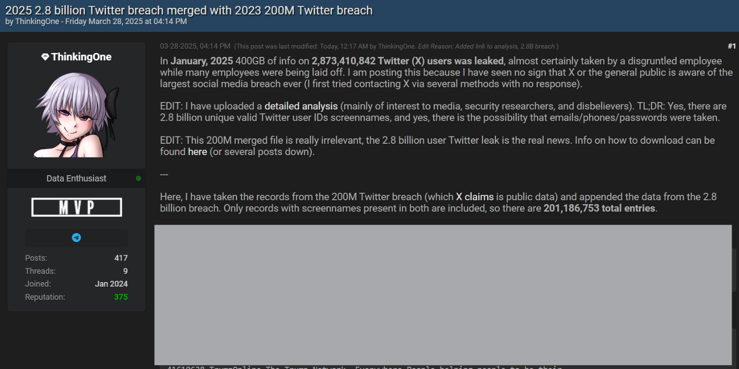 In what could become the largest data breach in social media history, a staggering 400GB of user data from Twitter (X) has allegedly been leaked, affecting over 2.8 billion accounts. The breach, which surfaced in late March 2025, was first reported by a user named “ThinkingOne” on BreachForums, claiming to have uncovered the data after months of investigation.